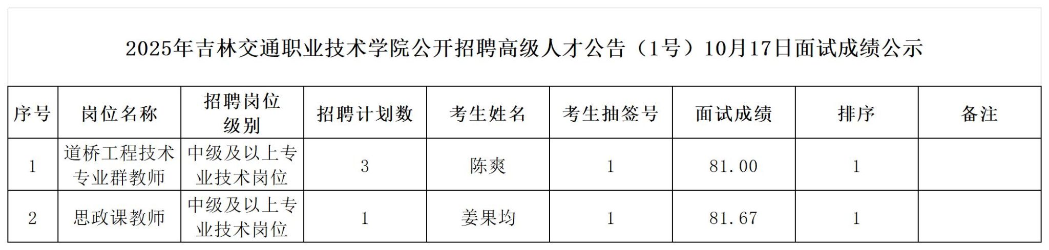 根据2025年吉林交通职业技术学院公开招聘高级人才公告(1号)有关规定,现将10月17日面试结果进行公示,公示期为5个工作日,自2025年10月17日至2025年10月23日。