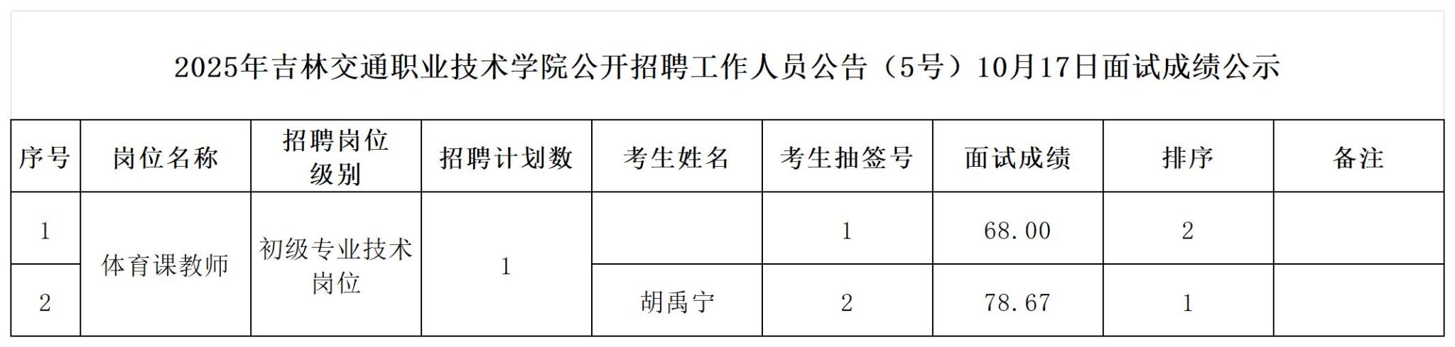 根据2025年吉林交通职业技术学院公开招聘工作人员公告(5号)有关规定,现将10月17日面试结果进行公示,公示期为5个工作日,自2025年10月17日至2025年10月23日。