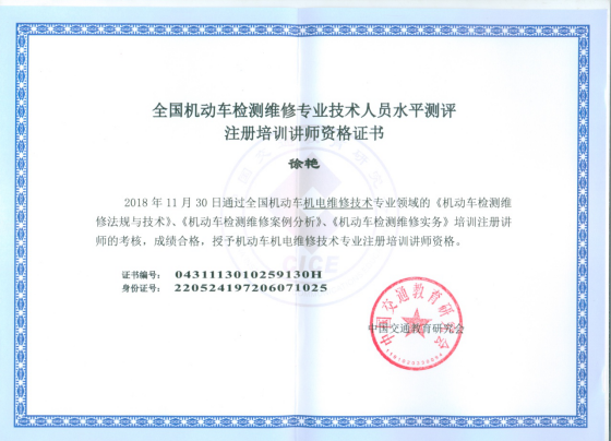 徐艳 吉林交通职业技术学院汽车工程学院实训中心主任高级实验师吉林大学汽车运用工程专业本科 中国交通教育研究会标准化技术委员会标准专家 中国诊断师技能竞赛吉林赛区冠军 吉林省高职院校技能大赛汽车检测与维修项目比赛优秀指导教师 国家职业技能鉴定高级考评员 长安福特校企合作定向班认证讲师 中国技能吉林省职业技能竞赛裁判吉林省首席技师裁判第45届世界技能大赛吉林省选拔赛---汽车技术项目竞赛裁判