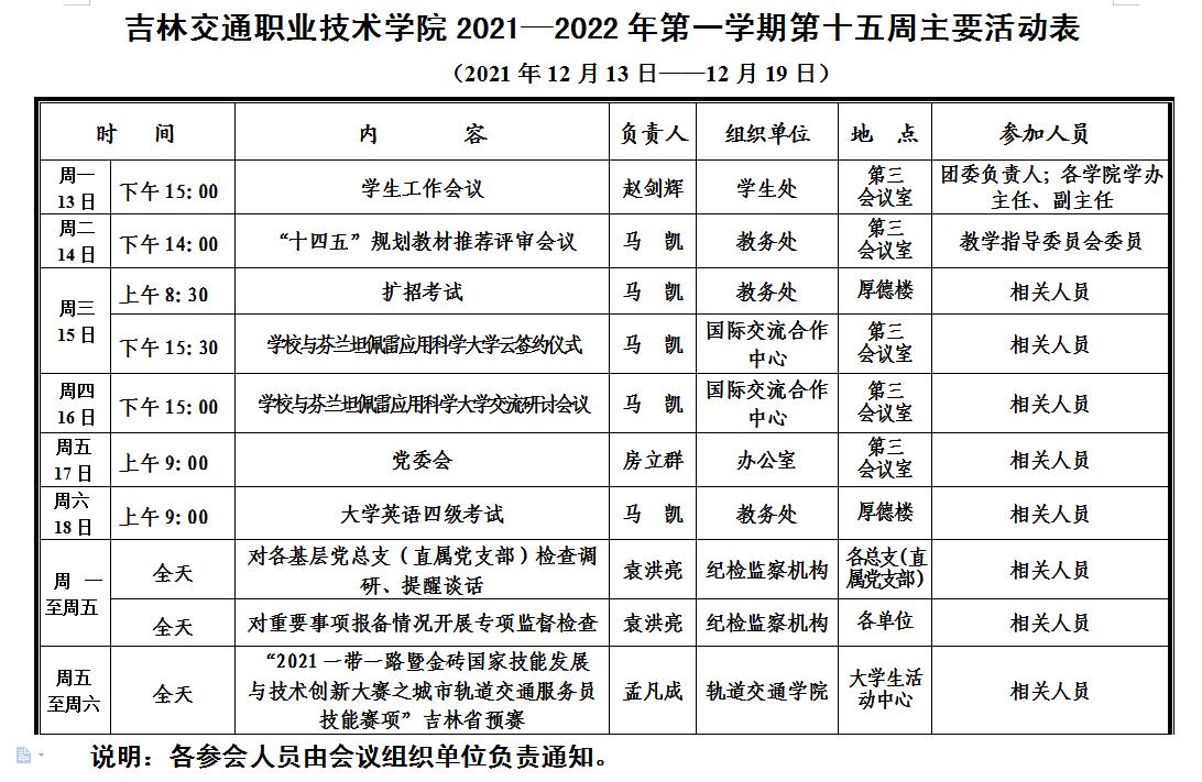 吉林交通职业技术学院2021—2022年第一学期第十五周主要活动表