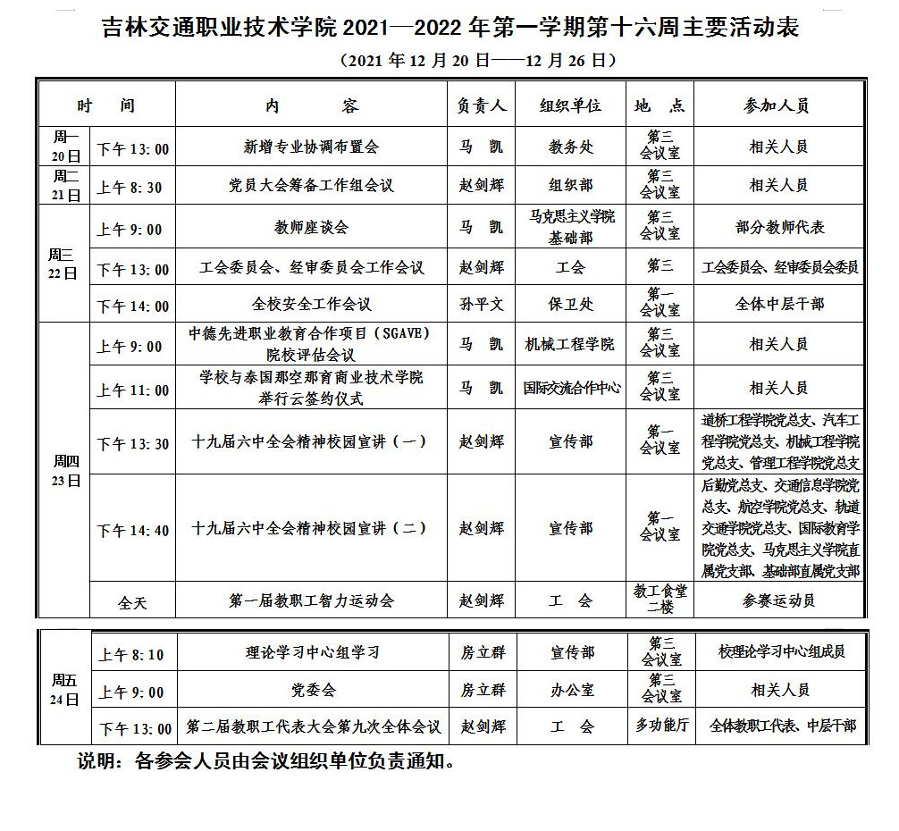 吉林交通职业技术学院2021—2022年第一学期第十六周主要活动表